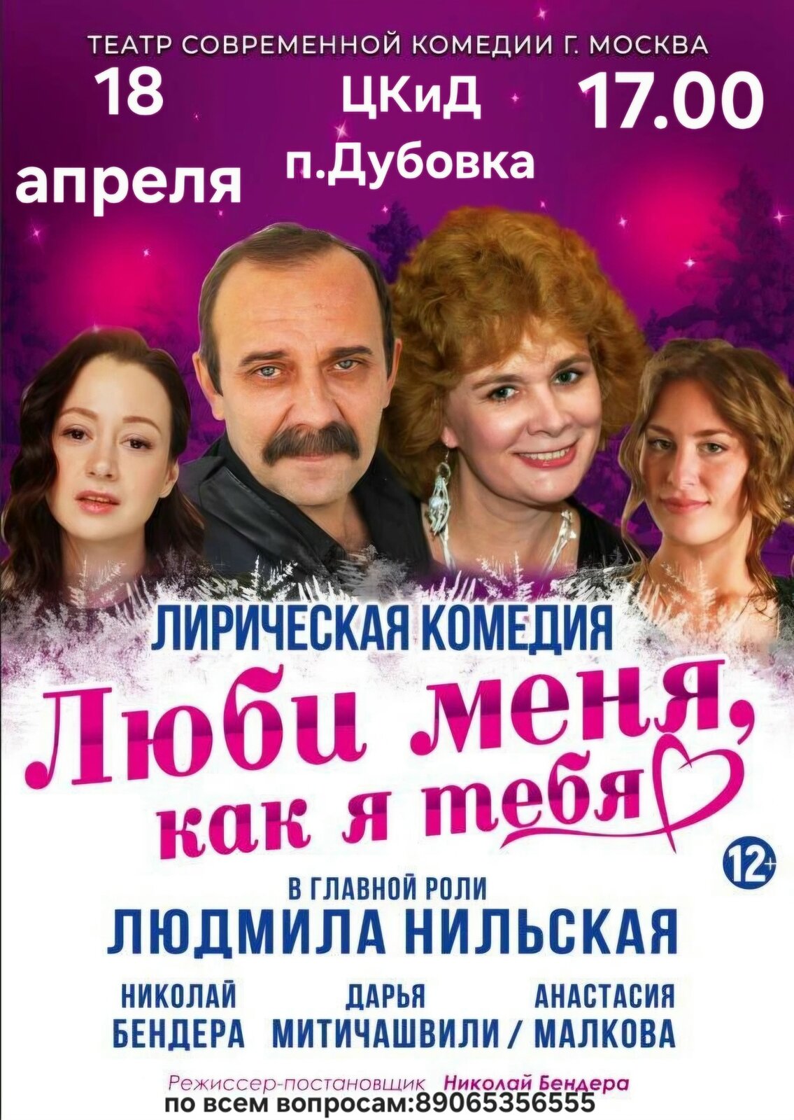 В ролях: БОРИС - Николай Бендера - главный режиссер театра, актер театра и кино. В его активе около 70 разноплановых ролей в кино. Среди них «Клад могилы Чингисхана», «Метод», Паутина-7, «Икорный барон» и др. ЛИДА - Людмила Нильская - обладательница кинопремии «Золотой Орел» за роль «Галины Брежневой» Известность к актрисе пришла в фильмах «Государственная граница» и «Петровка 38», «Обручальное кольцо», «Гардемарины, вперед», и др. 68 разнообразных кинопроектов.