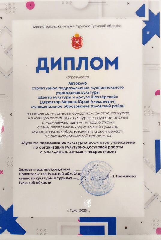 Директор Объединения центров Елена Арбекова приняла участие в награждении участников и победителей смотра-конкурса. Победителями стали: Автоклуб – структурное подразделение Центра культуры и досуга Шахтёрский, Узловский район; Автоклуб № 1 – структурное подразделение Передвижного Центра культуры и досуга Кимовского района; Куркинский автоклуб – структурное подразделение Куркинского районного центра культуры.