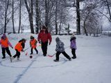 Этапами игры были прохождение дистанции с клюшкой и мячом, затем гонки на тюбингах, прыжки в мешках, перетягивание каната, ну и конечно хоккей на снегу. Такие зимние забавы отлично поднимают настроение и укрепляют здоровье.