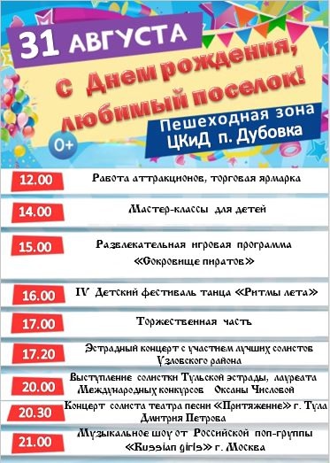 Отложите свои дела и приезжайте, приходите 31 августа 2025 года в посёлок Дубовка на праздник «С днем рождения,любимый поселок!». Не забудьте с собой улыбку, доброе слово и щедрость души. Начало праздника в 12 часов.