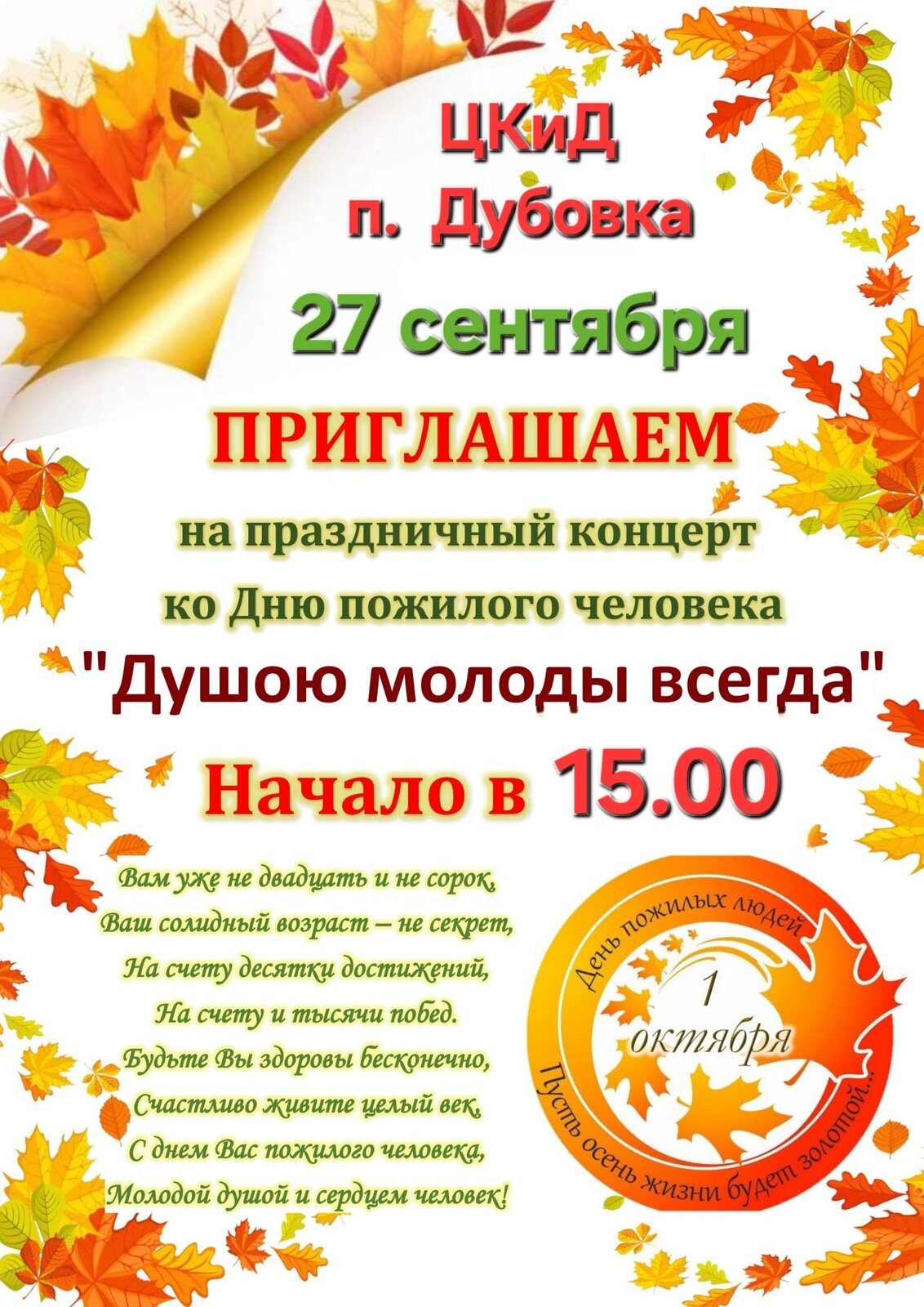 Приглашаем вас отметить День пожилого человека праздничным концертом, который состоится 27 сентября в 15:00 в Центре культуры и досуга нашего поселка.