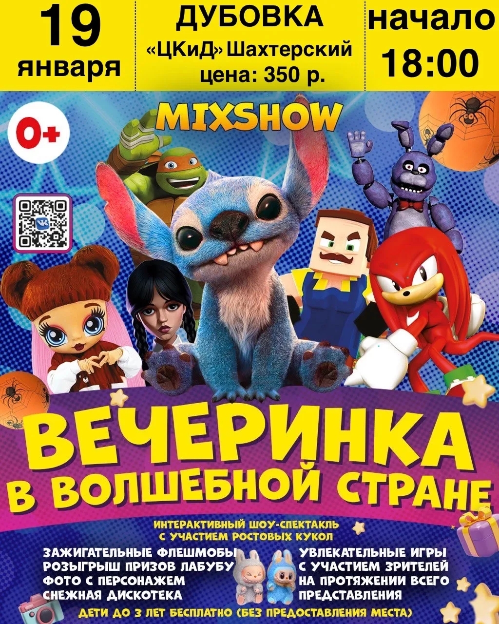 снежная дискотека, лазерная анимация,зажигательные флешмобы, игры со зрителем на протяжении всего шоу, продажа сувениров,розыгрыш призов, и конечно же, фото с любимыми персонажами!