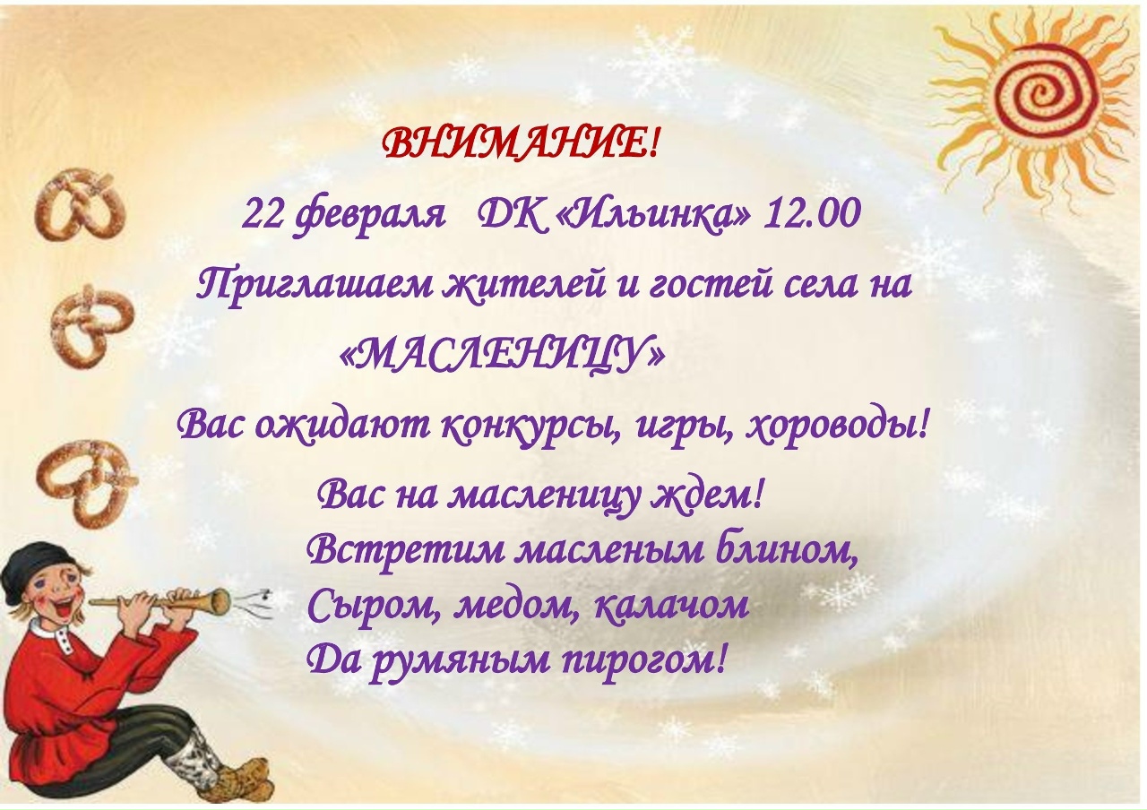 Мы приглашаем вас на празднование Широкой Масленицы, которая состоится на площадке у ДК "Ильинка" 22 февраля в 12 часов.