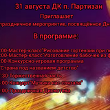 Уважаемые жители и гости посёлка Партизан!!!Приглашаем Вас 31 августа на праздничное мероприятие, посвящённое Дню Посёлка!!!